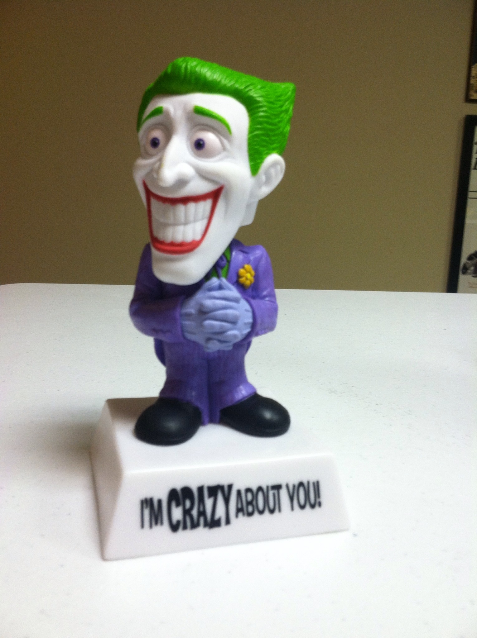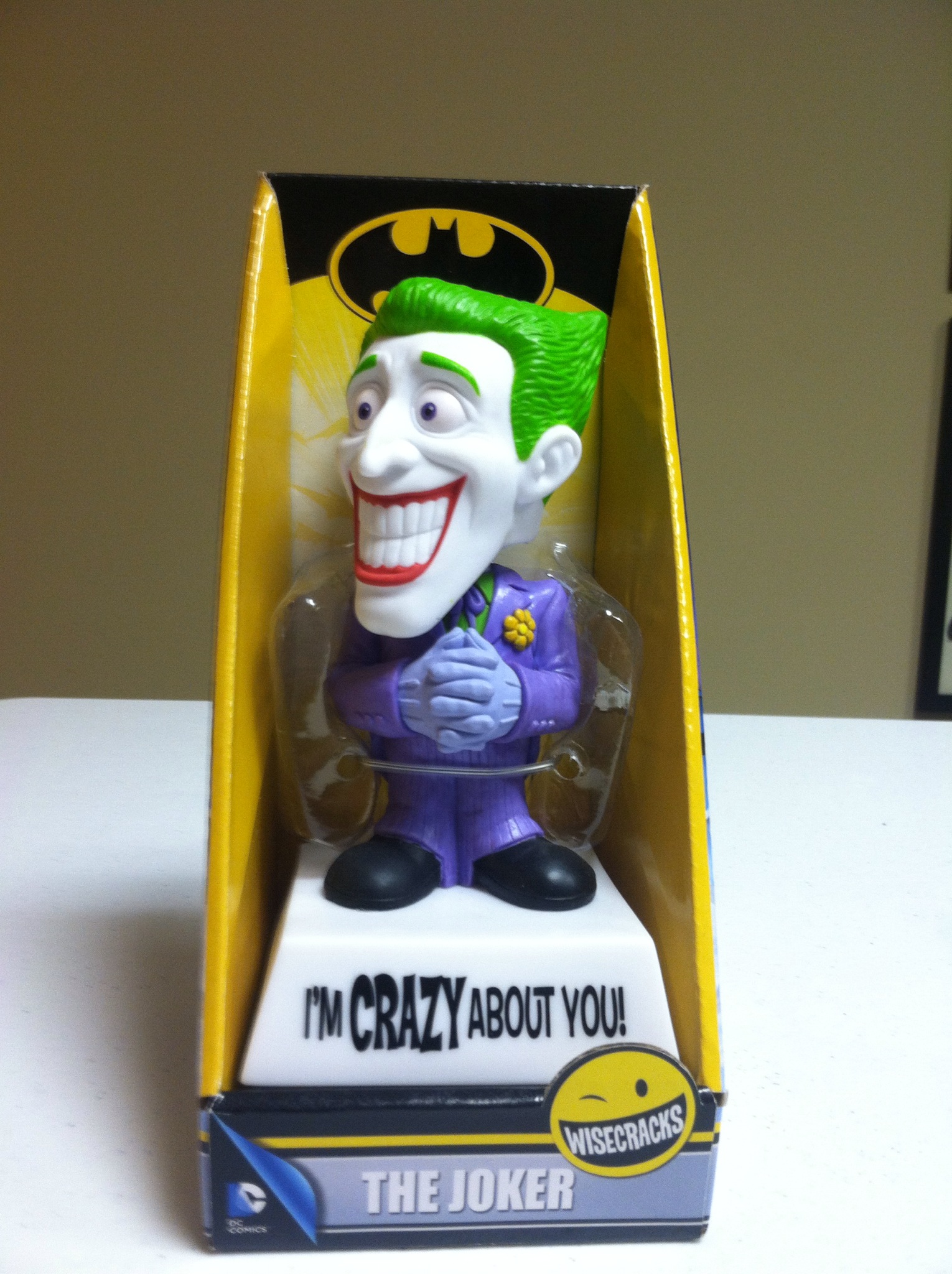 Here is a fun item! For DC’s new “Wise Cracks” line who would be better to include than the Mirth of Mayhem himself, The Joker? This bobble-head figure comes with the tag line, “You Drive me Crazy!”