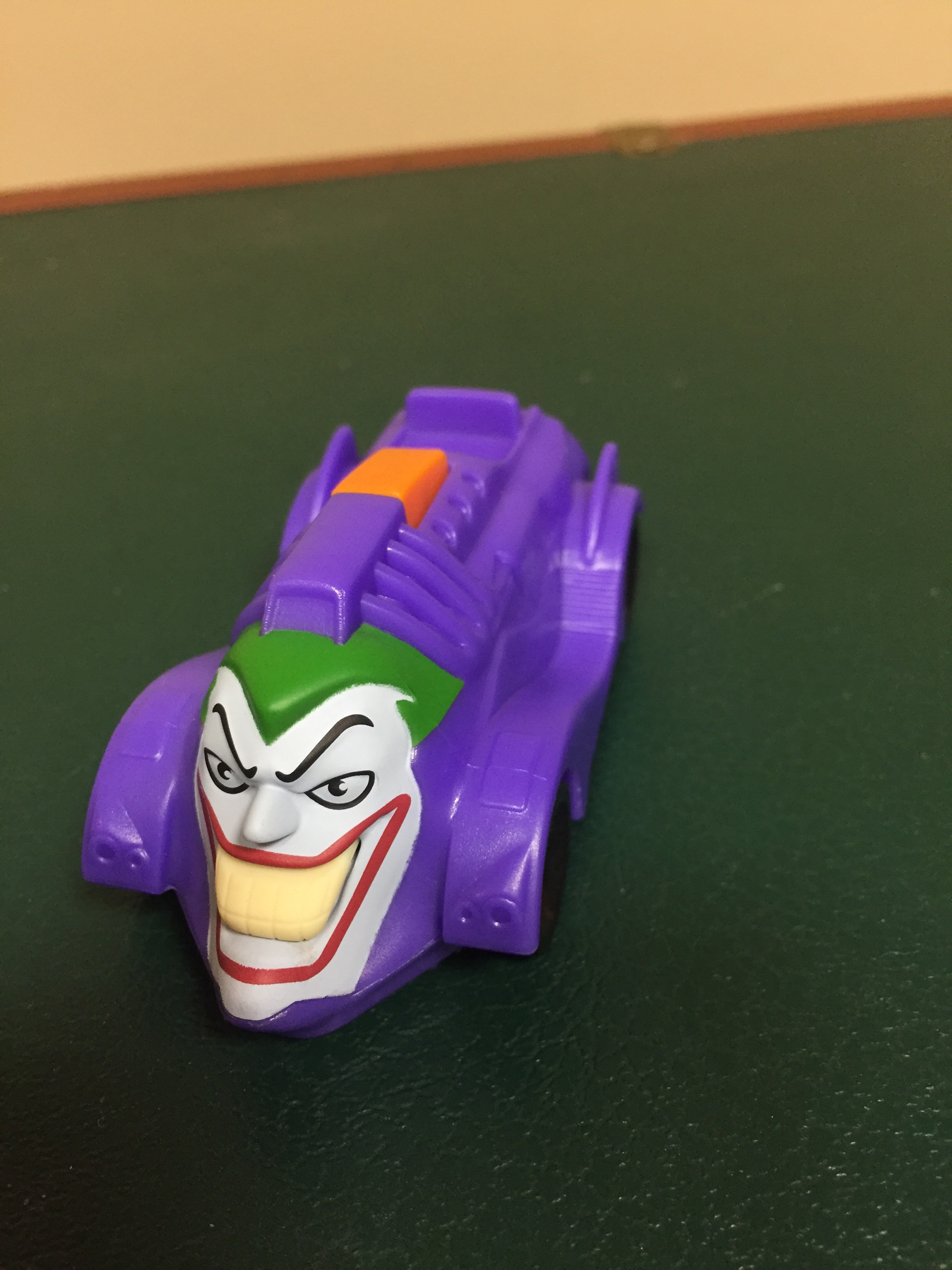 Here is the new Jokermobile from McDonald’s. It is based off the newest animated Batman series. Press the orange trigger on the back to launch the Joker’s teeth.