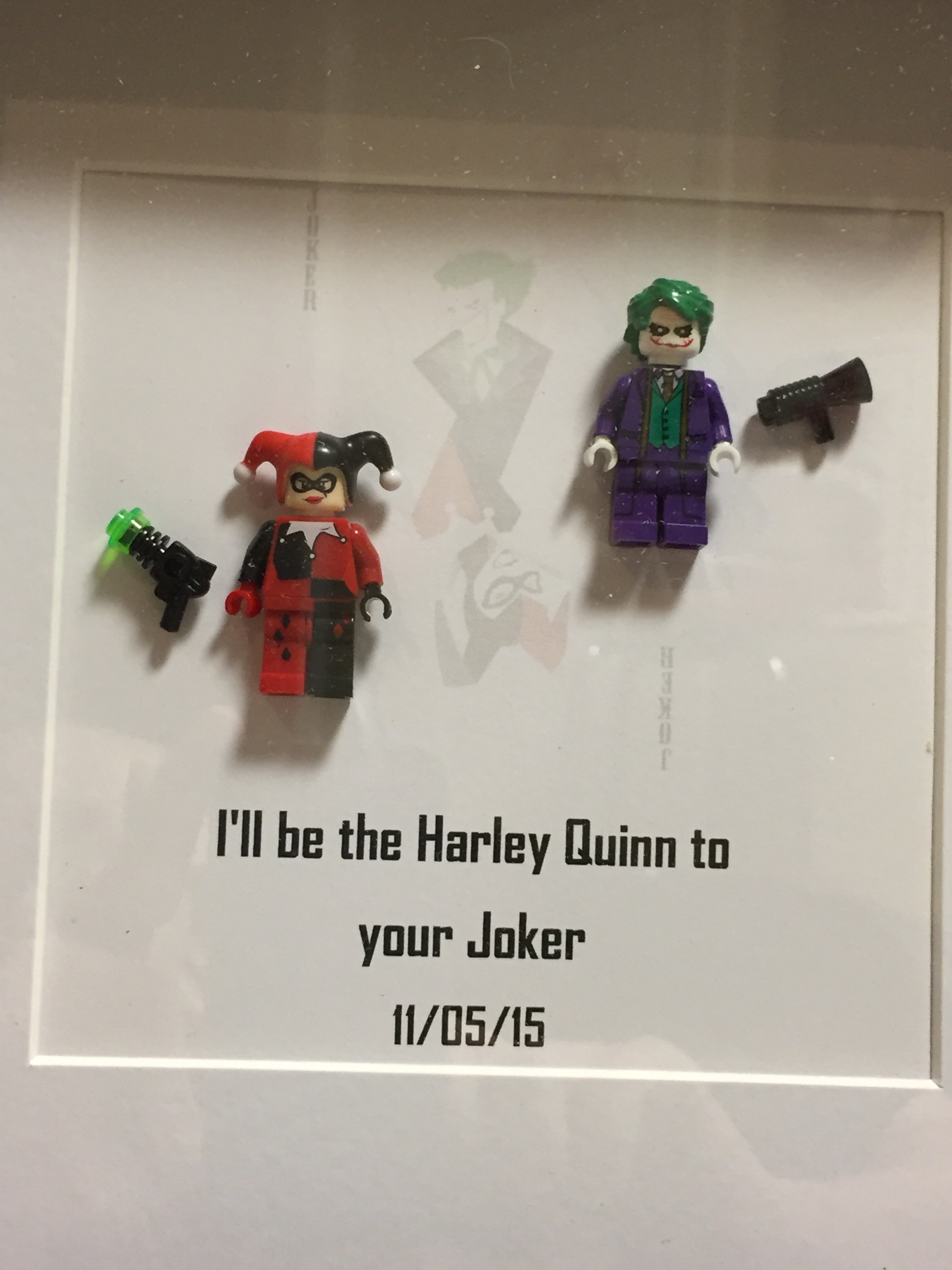 This is an awesome custom item featuring the Joker and Harley as Legos with our wedding date. Legos and Joker? Yes Please!