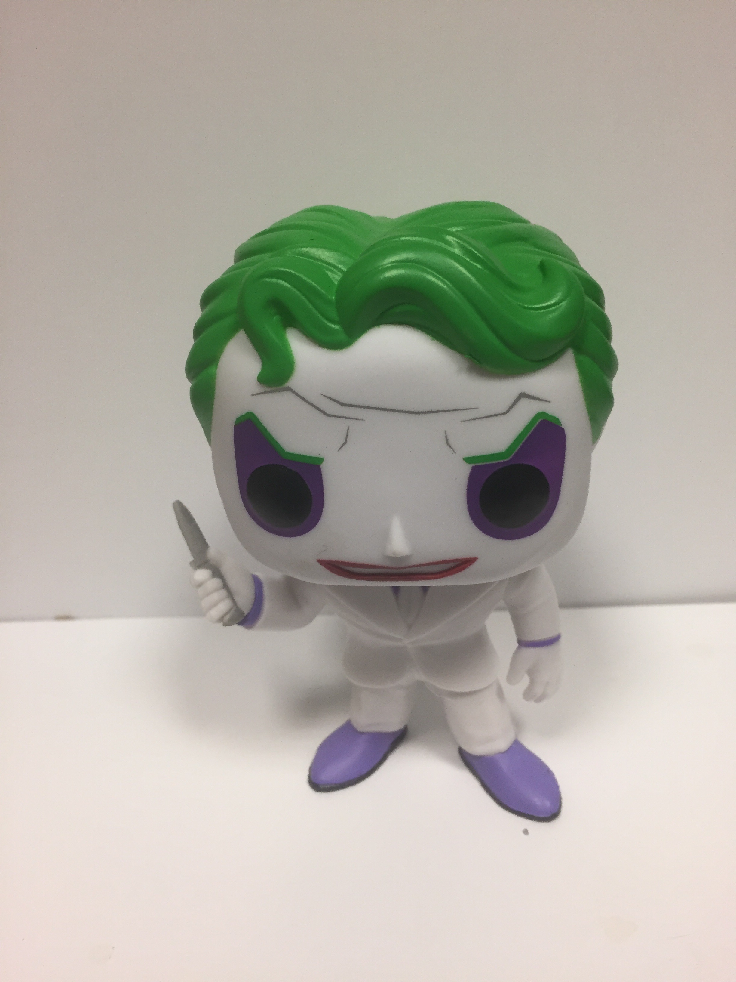 This is a Previews Exclusive figure and is just exactly what we have come to both love and expect about Funko Pop figures,fun and quirky design of a pop culture character. I love that they were able to capture one of the Joker’s darkest moments and make it “cute” while still staying true to the source material.