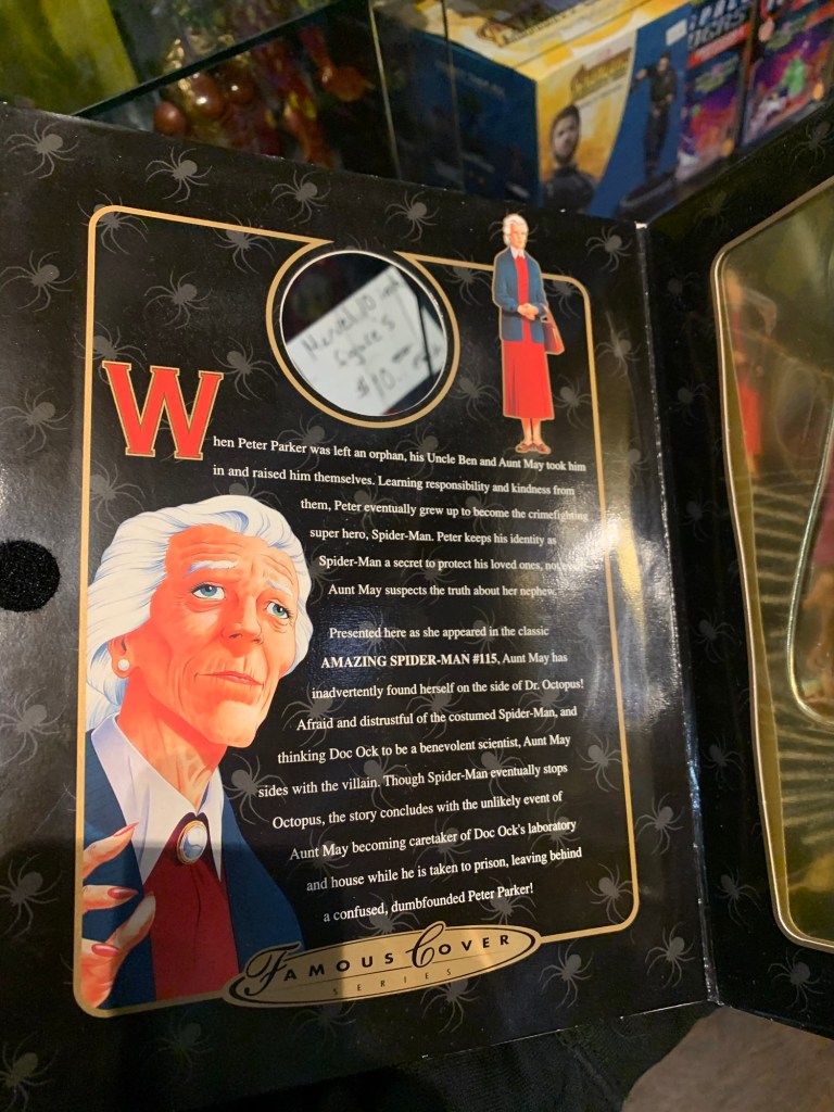 During the late 90’s Toy Biz starting throwing everything at the wall hoping for a hit. Famous Covers was a line that had much in common Mego’s line of action figures. The toys each stood around 8 inches tall, were fully possible and included real fabric clothes. A bunch of characters were made including Spider-Man, Captain America, Dr. Doom, Daredevil even…..Aunt May!