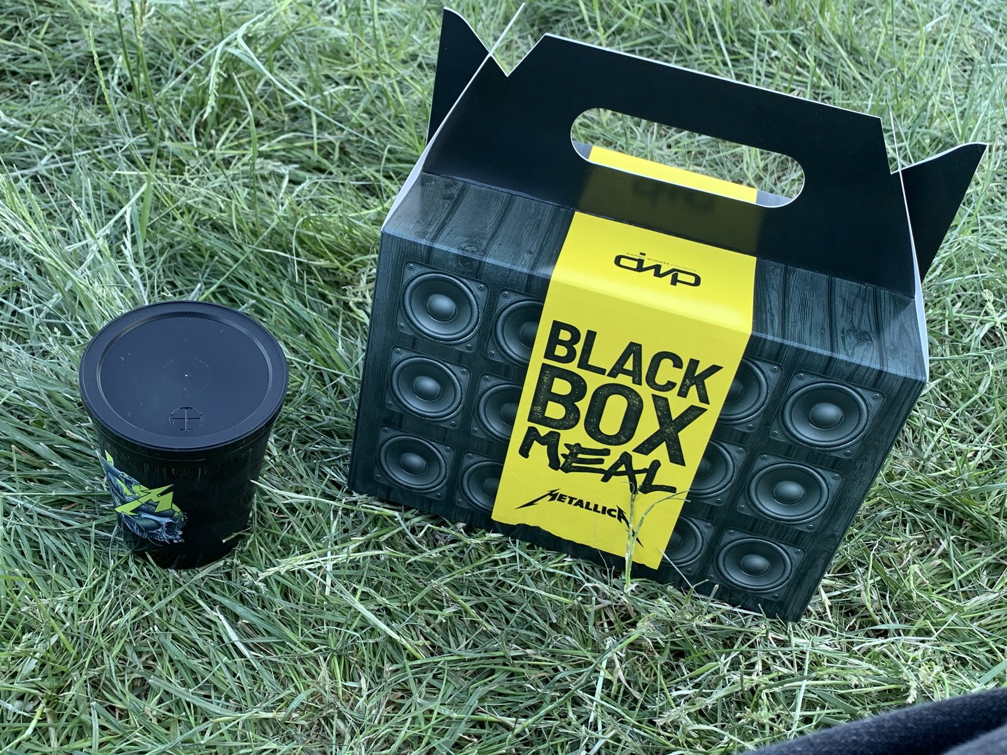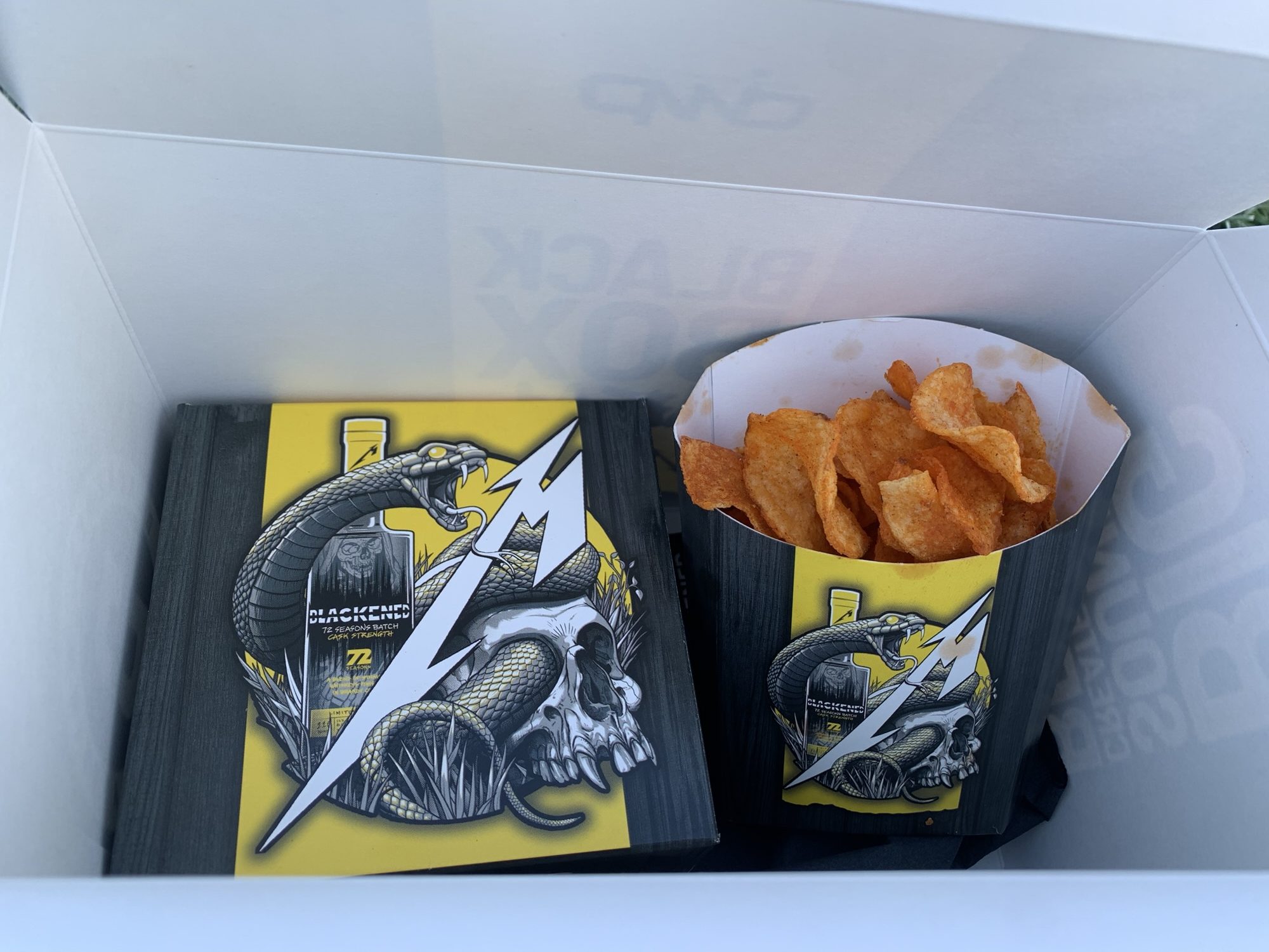 I attended Sonic Temple a few weeks ago and walked into one of the coolest experiences. Metallica expanded their Blackened Whisky tent to include some artisan hamburgers. Not only that but you could turn it into a Black Box Meal and get some chips and a drink brought out to you in a heavy metal version of a Happy Meal box.